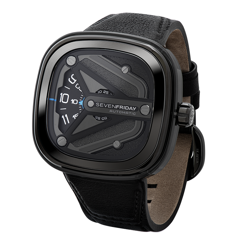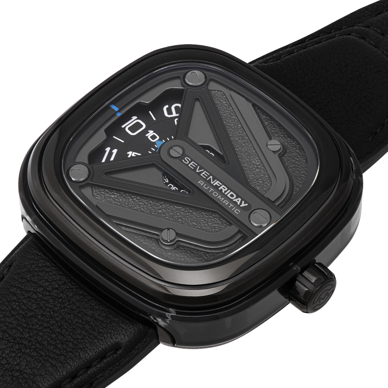 五層構造のケースと、ジェットブラックポリッシュとガンメタルグレインを交互に仕上げたメタリックデザインが印象的なM3/07 “SPACESHIP”。